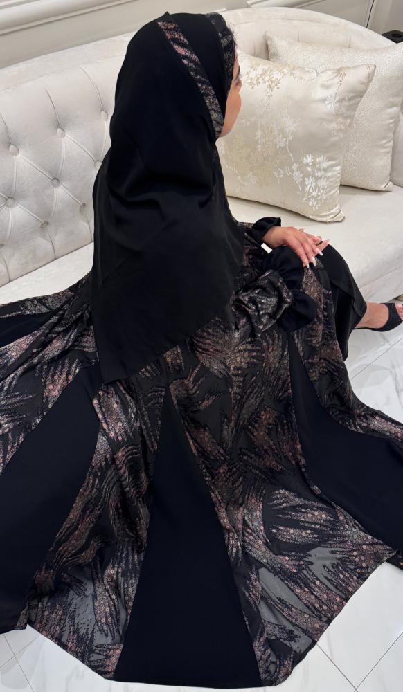 تصميم شيخة يدمج بين قماش شيفون ديجيتال مشجر المبطن وكريب الأصالة الفاخر، ليمنحك إطلالة ناعمة، خفيفة، وفريدة في كل تفصيلة.