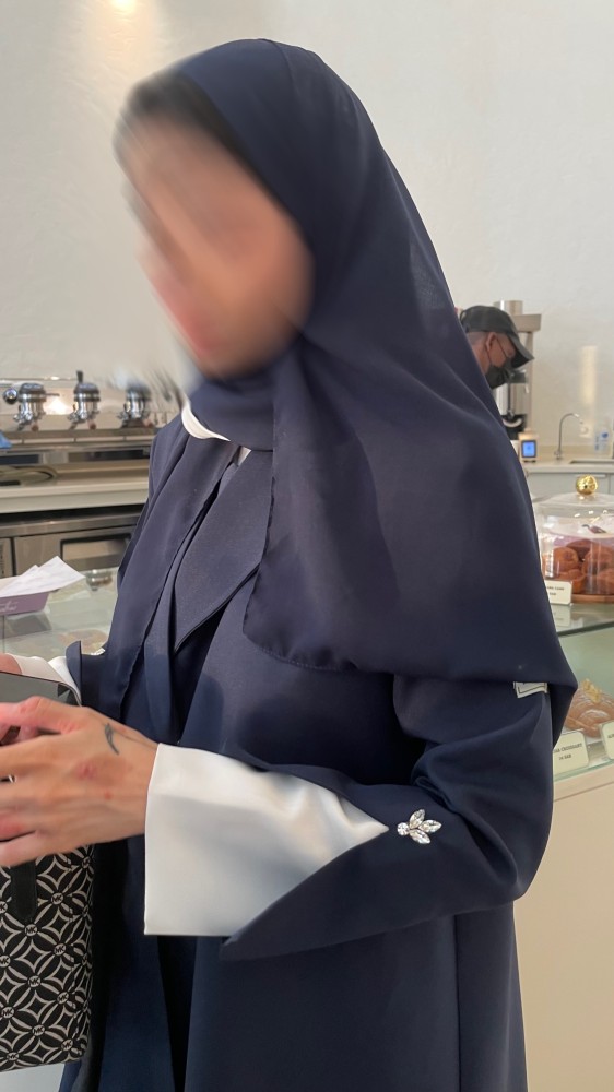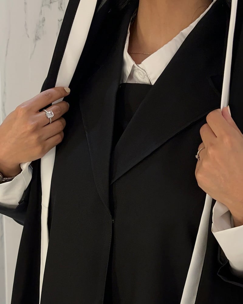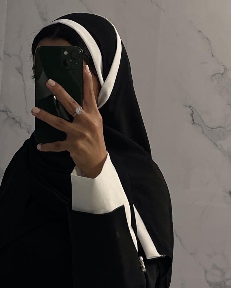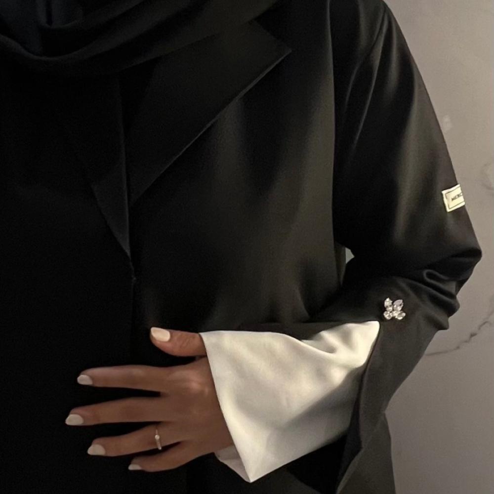 - طرحة سوداء بأطراف بيضاء: الطرحة تكمل الإطلالة بشكل أنيق، مع الأطراف البيضاء التي تعزز جمال العباية وتضيف لمسة من التفرد. 🧕🖤🤍🖤